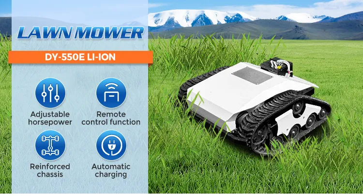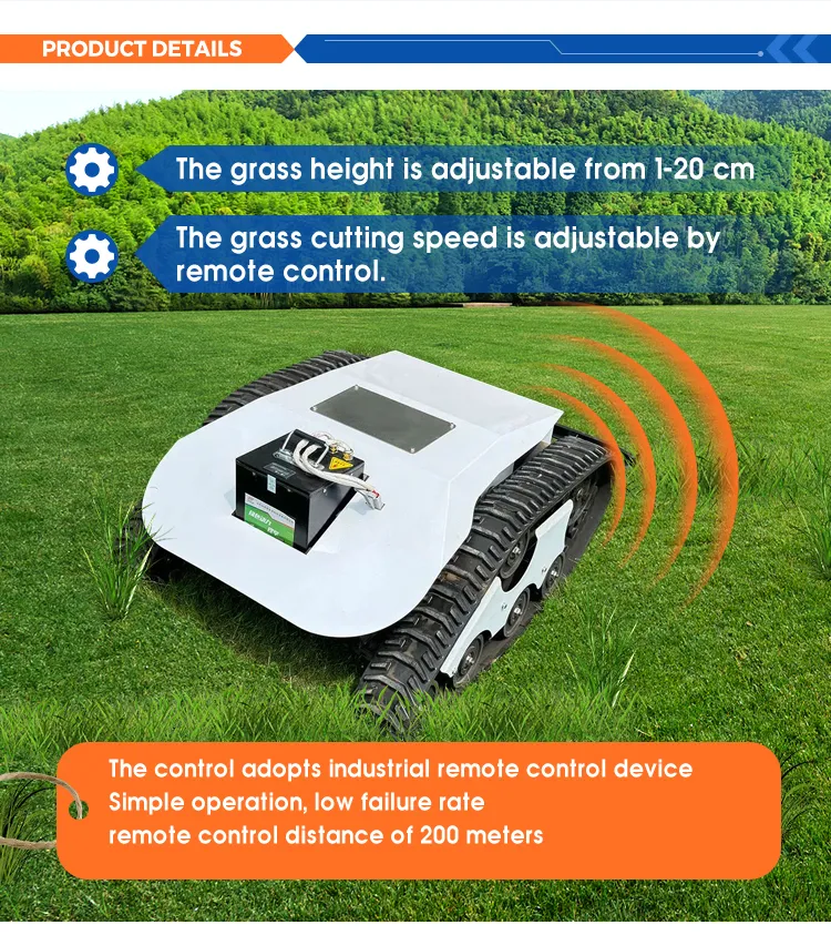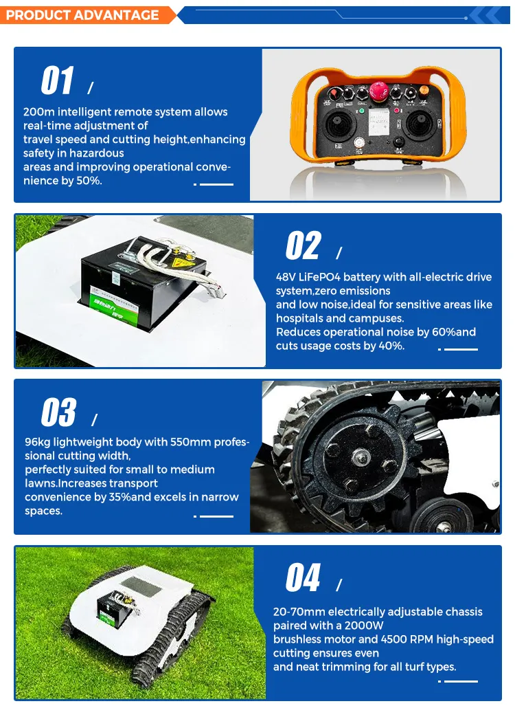 This lithium-powered lawn mower features a 48V LiFePO4 battery, ultra-low noise, and zero emissions. With a 200m intelligent remote control, 550mm cutting width, and high-speed brushless motor, it ensures safe, precise, and efficient mowing—even in narrow or complex terrains. Ideal for residential, campus, and landscape applications. Charging time: 7 hours, working time: 2-3 hours, battery weight: 15.5KG, battery parameter: 48V40A, remote control distance: within 600 meters